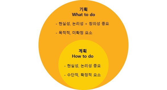 기획과 계획의 차이에 대해 알아보도록 하겠습니다. “계획은 기획 안에 포함되어 있다” 국어사전에서 기획의 정의는 ‘일을 꾀하여 계획함’이라고 되어 있습니다. 계획이 기획에 포함된다는 의미입니다. 한자로 기획을
